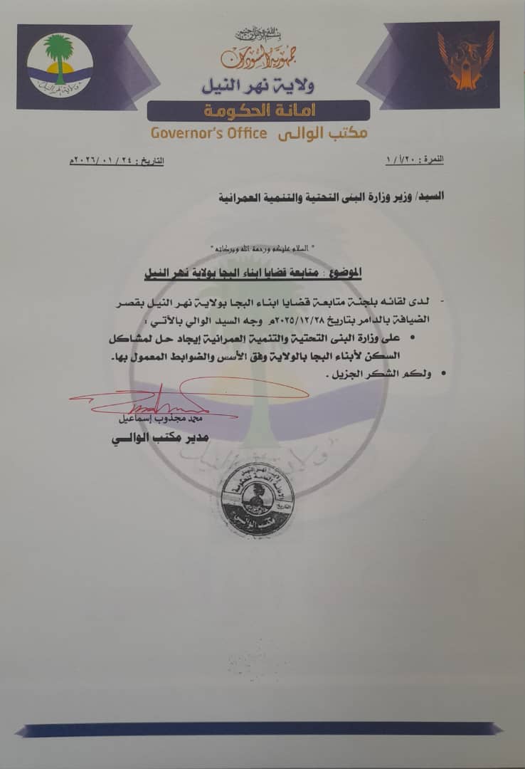 أصدر والي ولاية نهر النيل عدد من القرارات عقب لقاءه وفدا من لجنة متابعة قضايا أبناء البجا في الولاية.