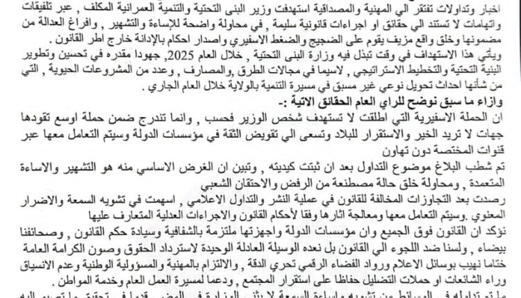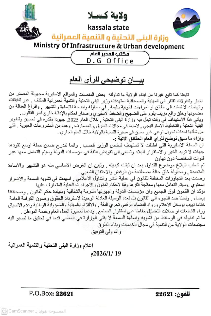 وزارة البنى التحتية بكسلا تصدر بيان اخبار بواسطة الأمل نيوز في يناير 19, 2026 0 وزارة البني التحتية بكسلا تصدر بيان 0 شارك
